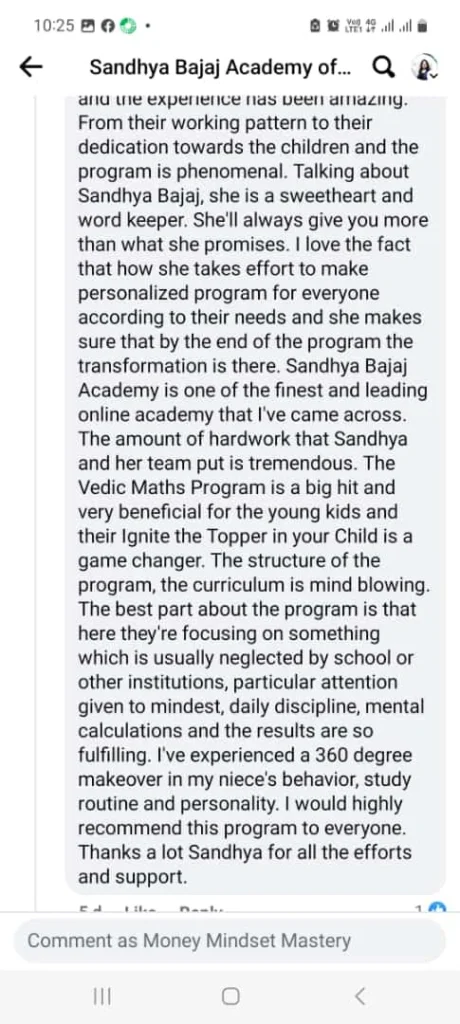 At Sandhya Bajaj Academy, I believe every child has the potential to excel. My mission is to make learning easier and more enjoyable by working on their Mindset, Memory, and Math. These pillars help children build the confidence to succeed academically and become future-ready by developing both their inner and outer selves through personality development.